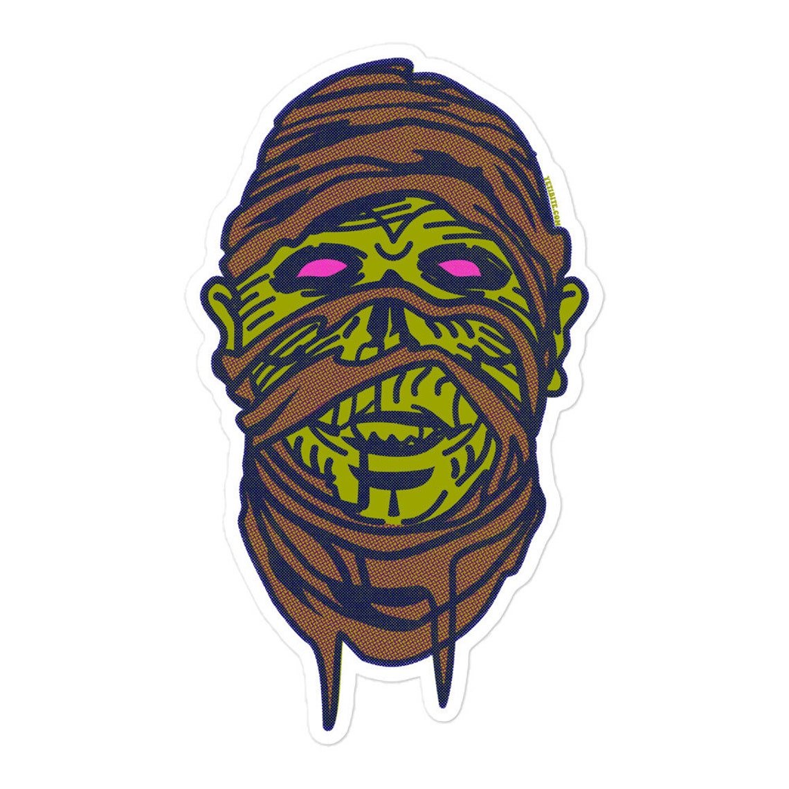 Retro-inspired Mummy illustration by artist Yeti Bite printed on a large high quality, glossy sticker perfect for your laptop, skateboard, kick drum, guitar, drink bottle etc.